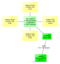 Funktechnisch kleine Setup sieht einen 5GHz AP mit moderater Richtwirkung nach Süden (Richtung Ivo's Haus) vor, z.B. eine CPE510. Auf Ivo's Dach ist die passende Gegenstelle im Client-Mode. Dieser Backbone-Link sollte genug Bandbreite haben um vier Sektoren die Teilnehmer im 2,4GHz Band versorgen, anzubinden. Das Teilnehmernetz im 2.4GHz Band anzusiedeln hat den den Vorteil, dass die Anzahl der erreichten Nutzer höher ist (weil verbreiteter als 5GHz) und die „niedrige“ Frequenz weniger durch die Schallführungen gedämpft wird. Die Sektoren (z.b. CPE210) laufen im AP Betrieb und haben die Mesh-Funktion deaktiviert. Durch diese point-to-multi-point Konfiguration soll erreicht werden, dass der Medienzugriff zentral koordiniert ist (CTS/RTS). Dadurch sollten Paketverluste geringer (und damit auch die Bandbreite höher) sein, als wenn der unkoordinierte Mesh-Modus aktiviert ist.